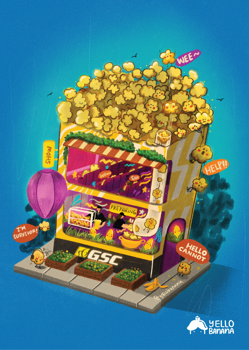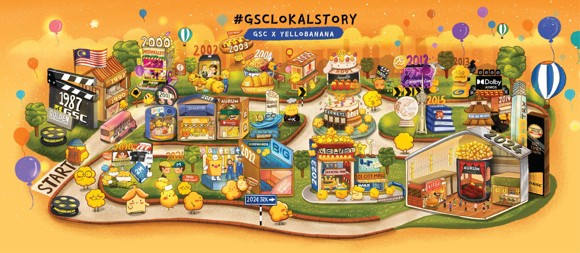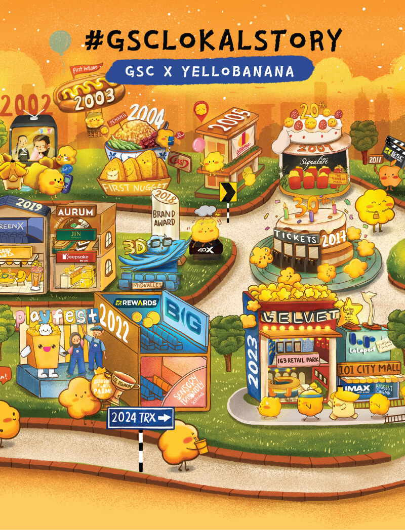 As part of Golden Screen Cinemas’ #MalaysiaKuBangga campaign for Merdeka and Malaysia Day, Yellobanana created a vibrant artwork that captures GSC’s journey — from humble beginnings to becoming a beloved part of Malaysia’s entertainment scene.